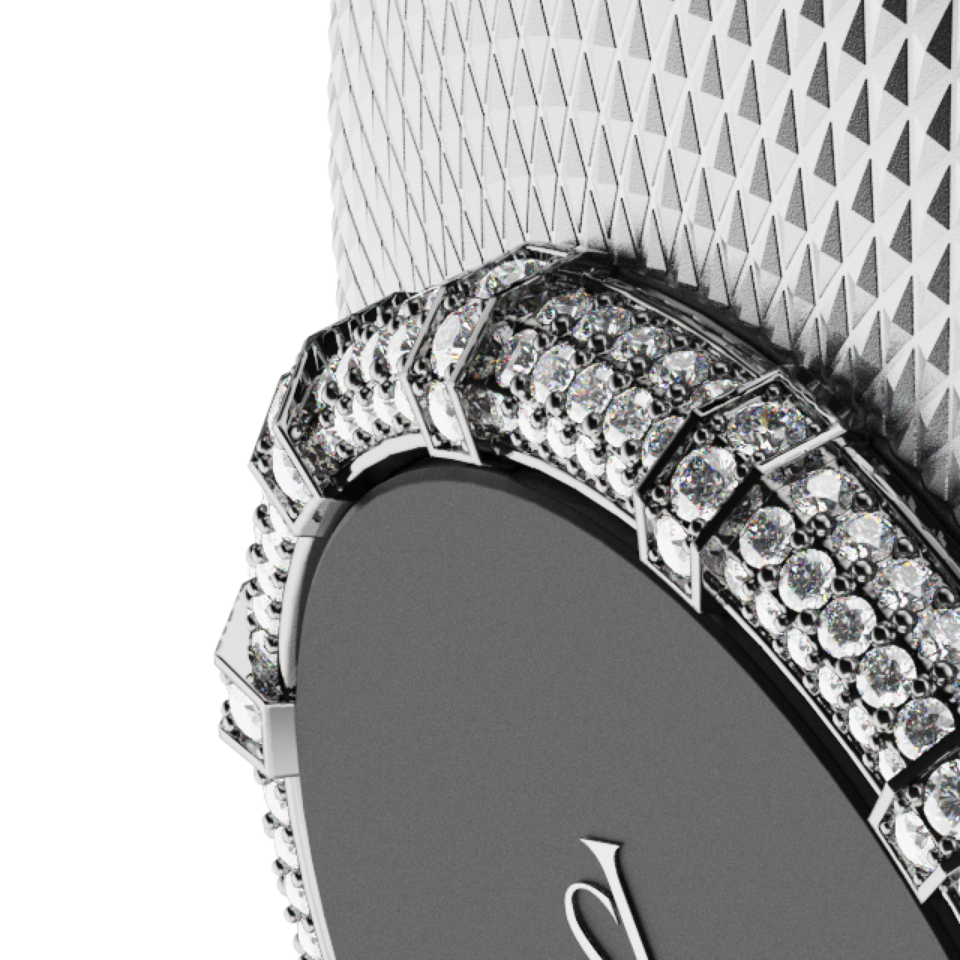 A striking harmony of purity and precision, the Ice Diamond edition features a handcrafted 14K white gold ring weighing 42.5 grams, set with 12.47 carats of dazzling diamonds - including 456 round brilliant stones. A refined expression of high jewellery, elevated through the language of sound.