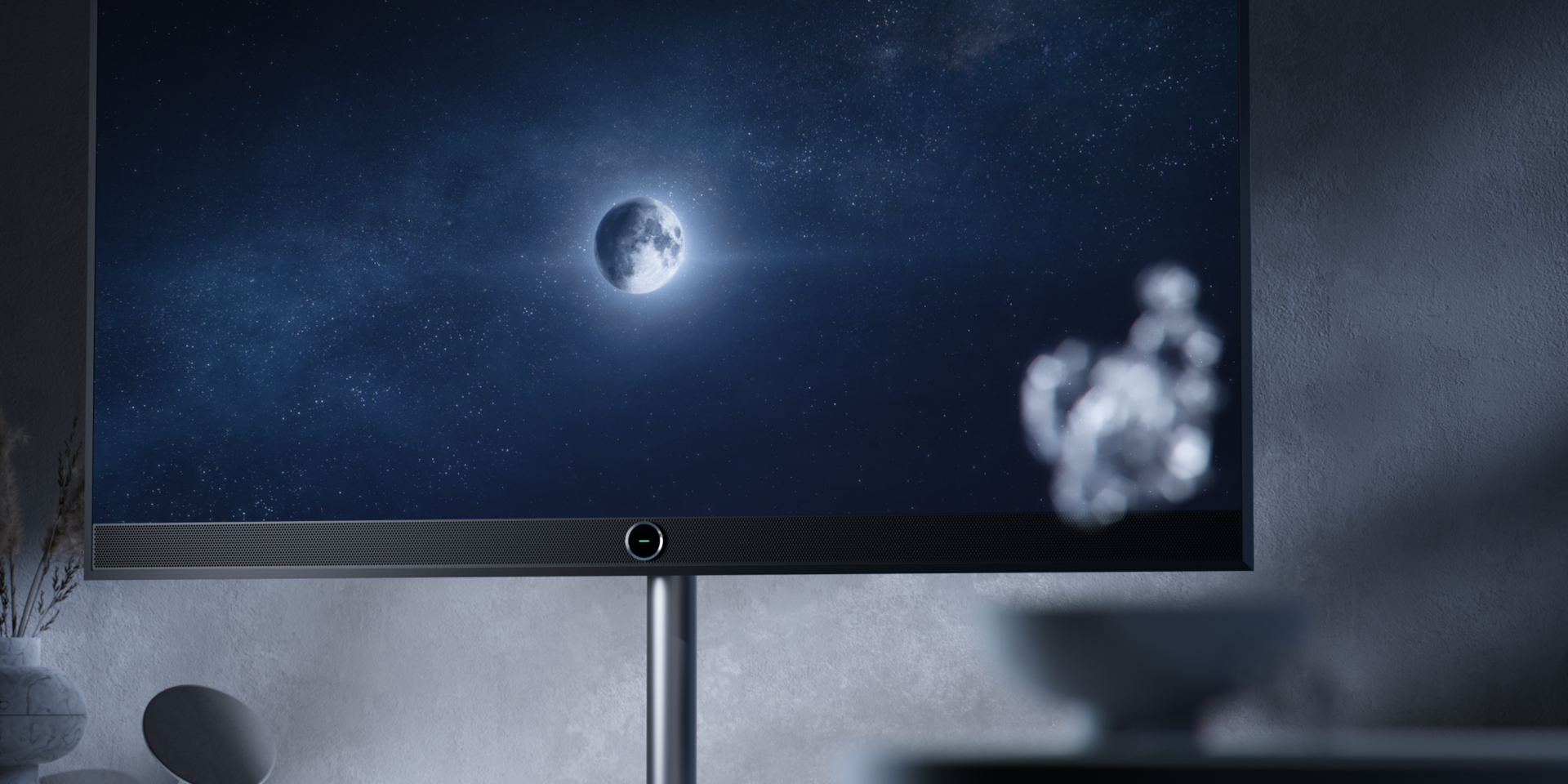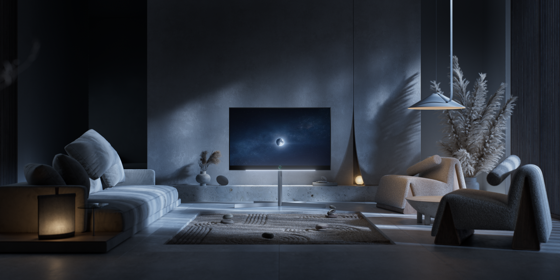 The breathtaking design of the Loewe stellar completely reinterprets the OLED flat screen. With real concrete back panel made with black pigments of cooled lava and black spray painted brushed aluminium frame. 100% Made in Germany. Experience an innovative lighting concept that creates magical moments of light and movement for an unrivalled viewing experience with the Loewe stellar.